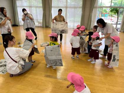 新聞がたくさんあり、もも組はテンションが上がっていました。遊びに来てくれていた小さな友達ともおしゃべりしながら、一緒に楽しみました。