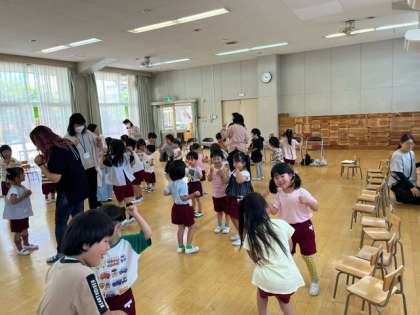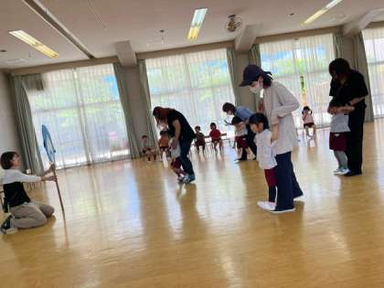 あか組からの誕生プレゼントはけん玉でした。お家の人と一緒にペンギンやサル、コアラの親子になって遊んだり、みんなで『ひっつきもっつき』をして遊びました。お家の人の足の上に乗って歩いたり、抱っこしてもらったり、おんぶしてもらったりして、とても嬉しそうな誕生児の子どもたちでした。