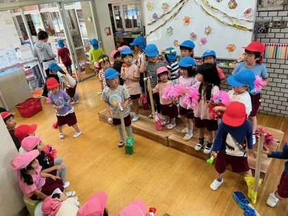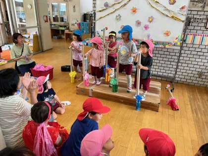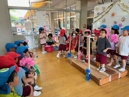 もも組の子どもたちは、お手製のマイクをスタンドに立てて、歌手になりきって遊んでいます。あお組が後ろでダンスをしてくれたり、お客さんが大きな拍手をしてくれたりして、盛り上がりました。