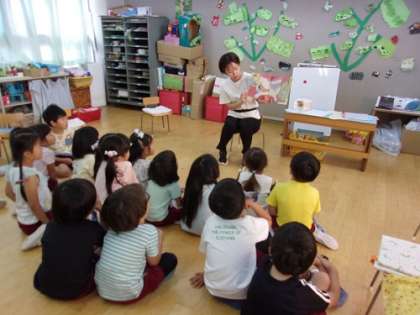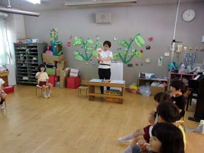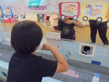 最初に、なぜむし歯ができるのかについての絵本を読み聞かせしました。また、今までに本物のむし歯菌を見たことがない子どもたちに、顕微鏡で見たむし歯菌(ミュータンス菌)の写真を見せました。子どもたちは、むし歯菌の写真を見て、「こわい」「歯みがきしなきゃ!」と言っていました。次に、むし歯にならないために、歯みがき体操の曲に合わせて、歯みがきをしました。最後に、水道で周りに飛ばさないように気をつけて、うがいをし、みんなでピカピカの歯になりました。