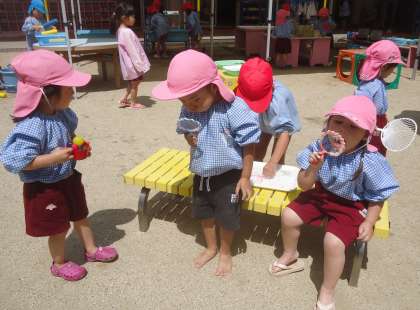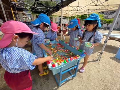 シャボン玉遊び、水鉄砲、色水遊び、スーパーボールすくいの遊びのいろいろな水遊びコーナーで、好きな遊びを見つけて夢中になって遊んでいました。