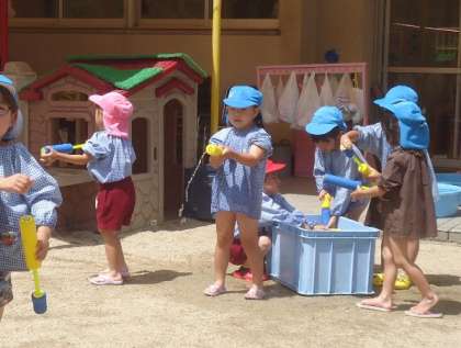 朝から水遊びの用意を見て、「早く遊びたい!」と子どもたちはうずうずしていました。朝の用意もとても早かったです。