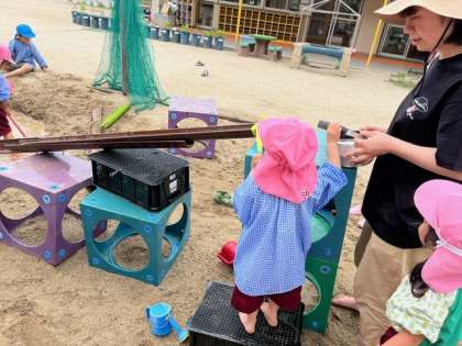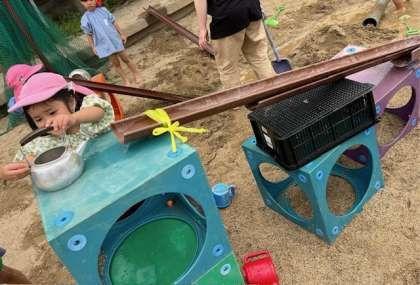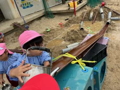 あお組がつくった道を見つけて、水を流し始めたもも組。水を汲んでは、樋の上から流して、「やったー、流れた」「もっと取ってくる」と何度も水を運んでは上から水を流していました。