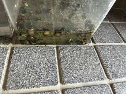 幼稚園でホタルの幼虫が成長中です。エサとなるカワニナも飼育中です。