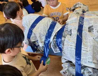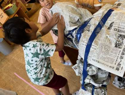 昨年にあお組がつくったかかし『おばけおに』を見ながら、今年のかかしの土台を作りました。「もっと大きいな」「いっぱい新聞紙いる」「くしゃくしゃして、いっぱいつけて、太くしよう」と言って、どんどんつけて、大きなカカシの土台になりました。