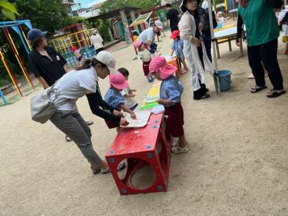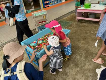 スーパーボールすくいや砂場、色水、シャボン玉など、普段幼稚園でしている遊びを、あか組、もも組も一緒にしました。