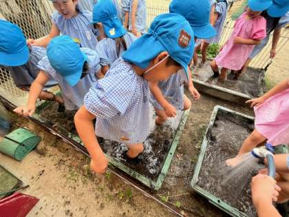 住吉大社の御田植神事の後に、苗が届くから用意しておいてねと教えていただいていたので、土作りをしました。先日から土を入れたり、水を入れたりしていましたが、今日はその土を踏みました。牛さんがしていたんだってと聞いた子どもたちは、「モー、モー」と口ずさみながら踏んでいました。