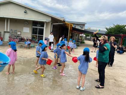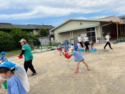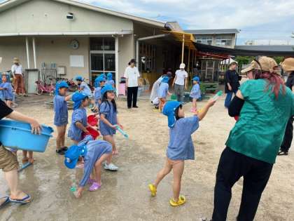 土つくりでどろんこになったあお組は、子育てセミナーで活躍してくださっている保護者も一緒に、園庭で水のかけ合いっこをして遊びました。水鉄砲やバケツで水をかけ、園庭中を駆け回っていました。