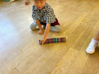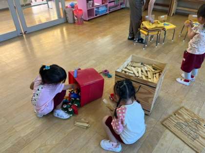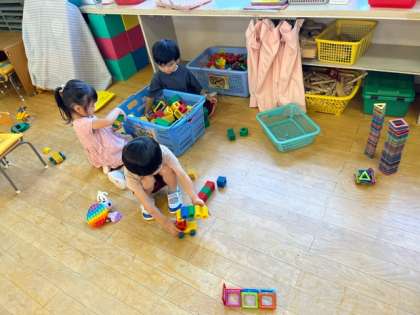 朝の用意ができたら、好きな遊びに夢中になって遊んでいます。一緒に遊ぶ友達もできてきて、近くで遊んでいます。