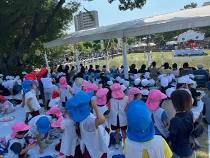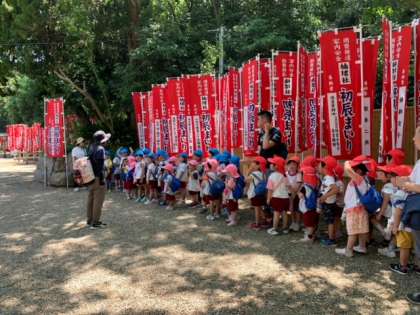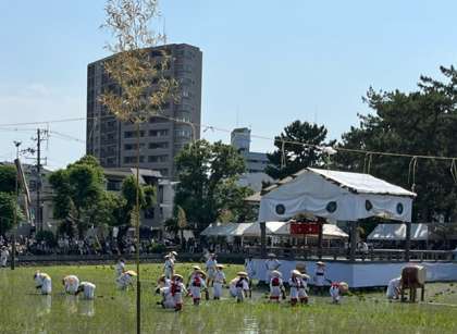 午後から住吉大社御田での御田植を見学に行きました。春にレンゲを摘んで遊んだところで、田植えをされている様子を見学しました。幼稚園でも田植えをしようねと楽しみにしていました。