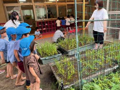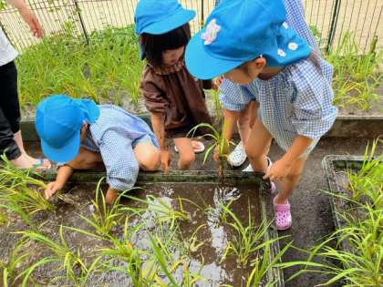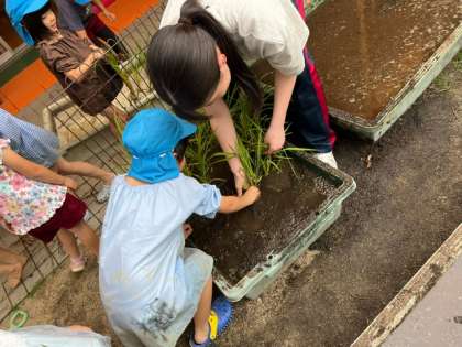 みんな、手足をどろんこにしながら、田植えをして、「しっかり根を入れなきゃ」と土の中に指を入れていました。最後に「全部植えられたね!」とみんなで喜ぶ様子が見られました。