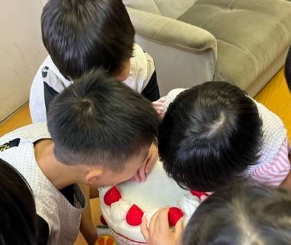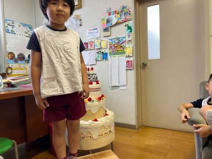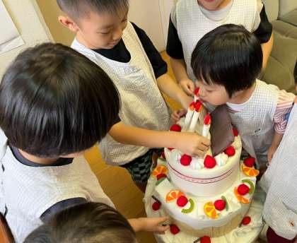 園長室の美味しそうなケーキが気になり、「食べたいな」と言っていて、ろうそくを吹き消したり、食べるふりをしてみんなで誕生会を楽しみにしていました。