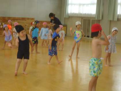 入水前には体操をします。足洗いやシャワーで水を浴びたりすることも知らせ、先生の真似をしながらやってみました。