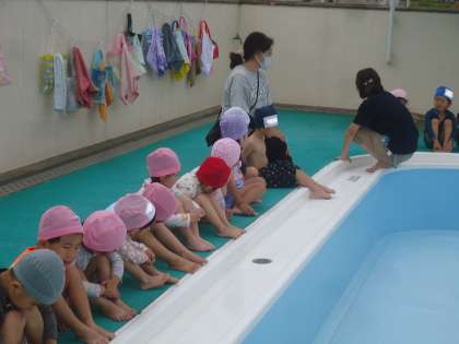 今日は、その前に、あか組・もも組一緒に、水着に着替えたり、プールを見に行ったりしました。