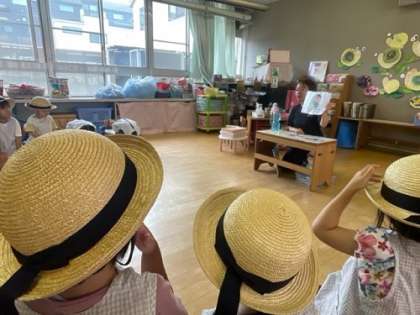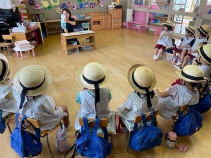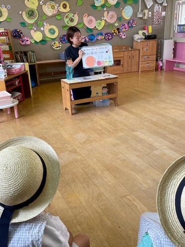 もも組に熱中症予防の保健指導を行いました。体はたくさんの水でできていて、汗をかいて体の中の水がなくなると「熱中症」になってしまうということを知らせました。そこで、熱中症にならないための4つの約束を知らせると、「熱中症になりたくない」「約束守れる!」と言っていました。幼稚園にある暑さ指数を示すボードについて話し、オレンジ(厳重警戒)や赤(危険)になっていると、外遊びができないことを確認しました。