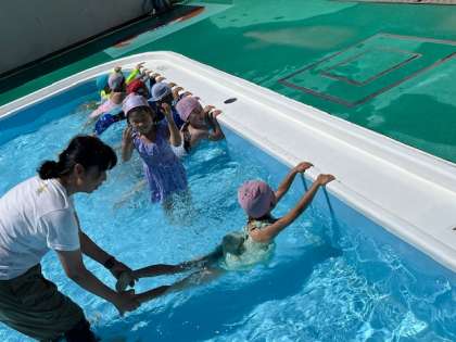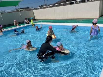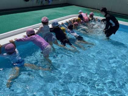 プール遊びが大好きなあお組は、水に浮くことが楽しくなってきているので、ビート板で浮いたり、プールサイドを持ってバタ足をしたりして楽しんでいます。