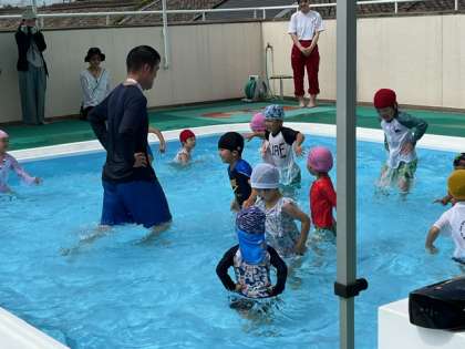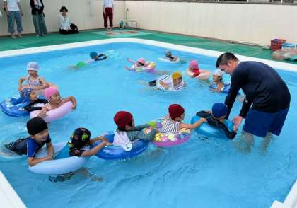 ずいぶんと水に慣れてきたあか組。水の中で体操をしたり、カラーボールを集めたり、浮き輪に乗ってつながったりして、楽しんでいます。