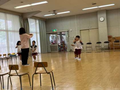 「楽しい体操しよう」とリズム室で、誕生児でしました。あお組は「楽しいな」「簡単や」「誕生日の人だけでするの、初めて」と喜んでしました。