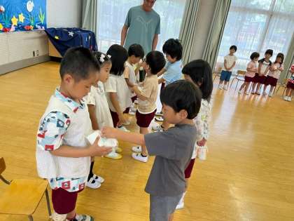 星の子になって入場してきた子どもたち。星をキラキラさせて、嬉しそうでした。自己紹介では大きな声で言っていました。あか組がつくってくれたロケットのプレゼントももらいました。ひとつ大きくなったことがとても嬉しそうでした。