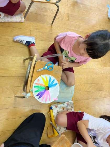 紙皿にいろいろな色のテープを通して、花火を表現してつくりました。「きれいな色でつくってるの」とていねいにつくっていました。