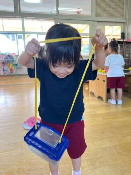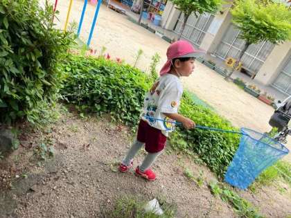 昨日のセミ採りが楽しくて、今日も園庭にセミを捕まえに行きました。近くにいたお家の方が抱っこしてくれて、捕まえることができ、「自分で採れたな」と嬉しそうに話していました。保育室に飼育ケースを持ってきてくれると、「それやったら持てる」と首からかけてセミを見ていました。