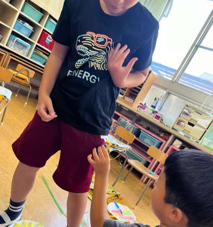 年長児になると、「触れるよ」「服につけてみて」と手で捕まえていました。