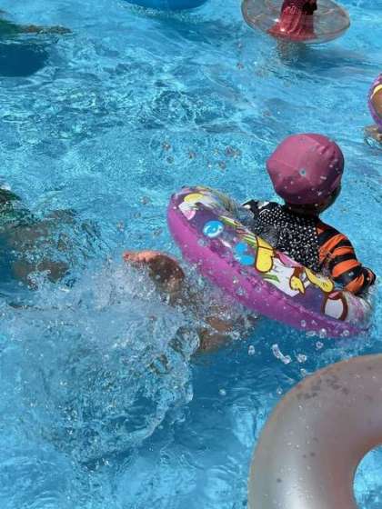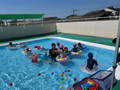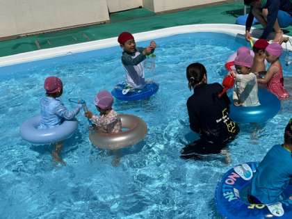 今日のプール開放は、今年度最後のプール遊びでした。元気に参加した子どもたちは、水鉄砲をしたり、浮き輪に乗ってバタ足をしたりして、自分のできることをして楽しみました。