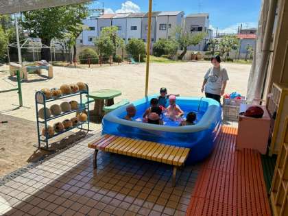 夏休みの預かり保育が最後の日、今年のプール遊びも最終日になるので、ゆっくり入りました。顔をつけたり、泳いだり、思い思いにプール遊びを楽しんでいました。あお組が顔の付け方を教えてくれて、赤組で怖がっていた子どももほほをつけてみて、真似てみて、できたので、嬉しそうに笑顔なり、あおくみからほめてもらっていました。
