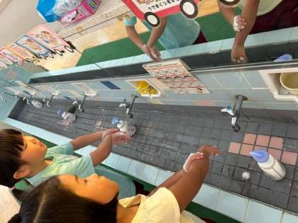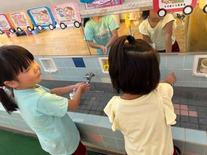 朝、幼稚園に来たら手洗いうがいだねと友達と一緒に手洗いうがいをしています。