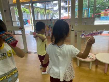 明日の誕生会でプレゼントする、トンボひこうきをつくりました。