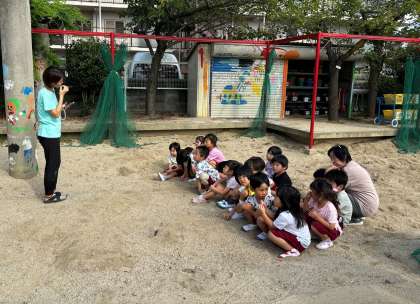 屋外スピーカーから聞こえてきた、非常事態を知らせる音や先生の携帯からの警告音を聞き、揺れに備えて机の下に隠れたり、預かりの先生と一緒に園庭に避難しました。