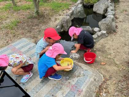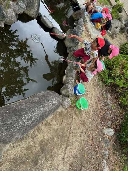 夏を過ごして、池をのぞくと、赤くて大きくなったザリガニが、たくさんいました。釣り上げようともも組は必死になり、あか組は励ましながら自分でも頑張っていました。