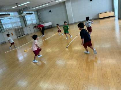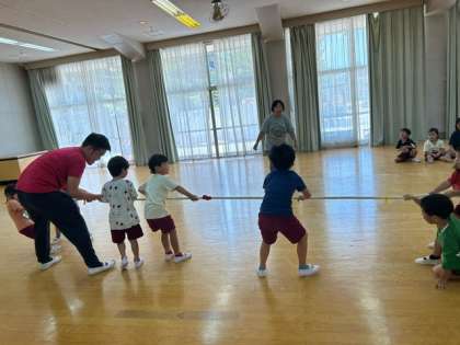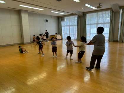綱を置いてある部屋に来たあか組。並んでいる綱を見て、ジャンプし始めました。飛び越えて遊んでいましたが、「違う、綱引きや」と言う子どもがいて、「こうやって引っぱる」「オーエス、オーエス」と引っ張っって遊びました。
