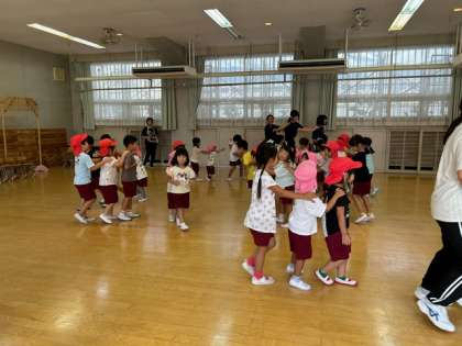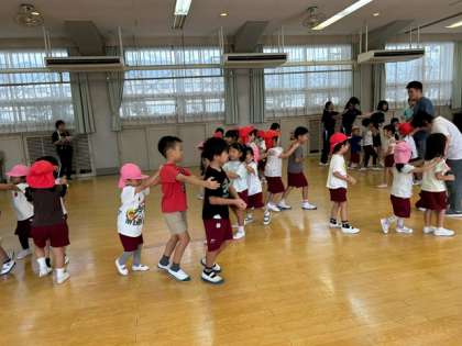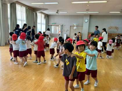 その後、音楽に合わせて、列車の運転手を交代しながら、いろいろな組の友達とも遊んで、1日を始めることができました。