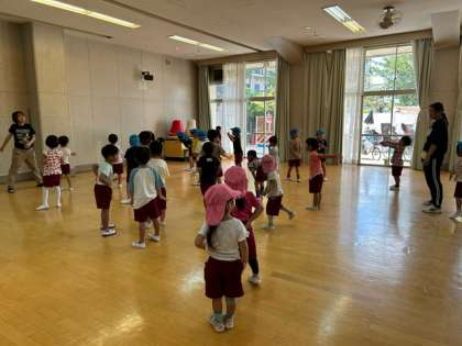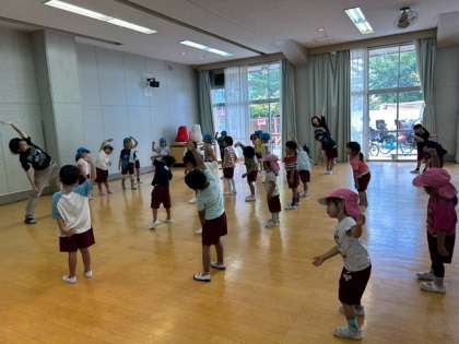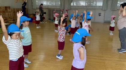 「ラジオ体操って聞いたことあるけど、やってみると難しいね」と手や足の動きを一つずつ確認しながら体操をしました。しっかりと手を伸ばしたり、膝を曲げたり、曲げなかったりといろいろとありました。終わった後は「疲れた」と言ってましたが、「楽しかった」っと言ってました。