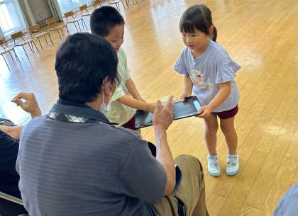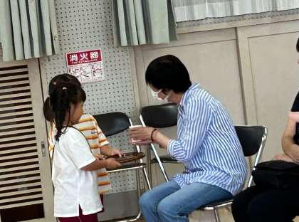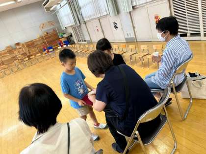 休憩時間にはあお組がおもてなしで、お茶を持って行って、「どうぞ」とお渡しして、休んでいただきました。