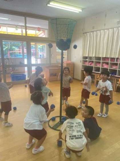 玉を出すと、一斉に投げ始め、「惜しい!」「難しい、もう一回」と思い思いに遊んでいました。