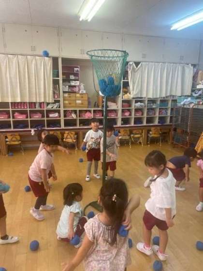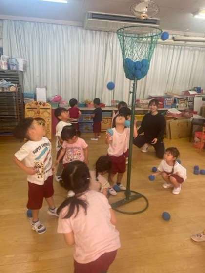 もも組さんにとっては、上にねらって投げるというのは、少し難しい動きなのですが、「かごに入れたい!」という思いが大きく、何度も挑戦していました。
