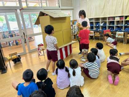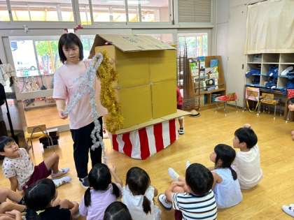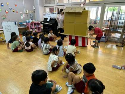 夏祭りでお神輿を運んで楽しかった思い出から、大きなお神輿をみんなで作ることにしました。どんな色にしようか、どんな飾り付けをするのがいいか、みんなで考えています。