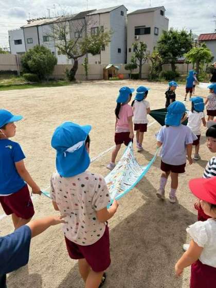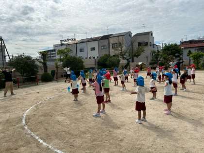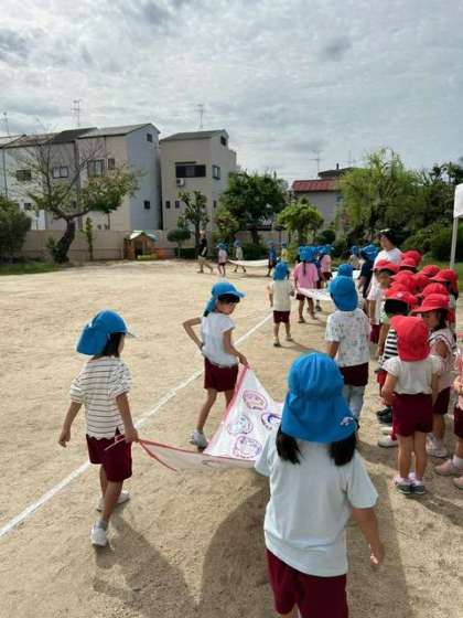 あお組は今まで憧れていた旗を持っての入場。4人でしっかりと持って入場しました。友達と合わせて一緒に歩くことの難しさも感じていました。その後、みんなでラジオ体操もして、1日を始めました。