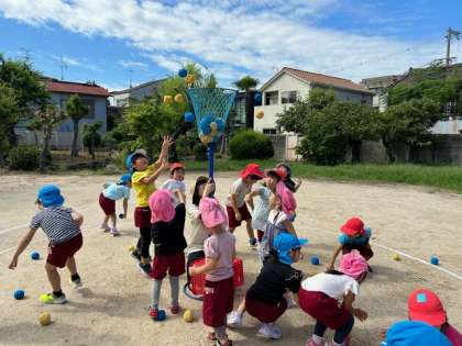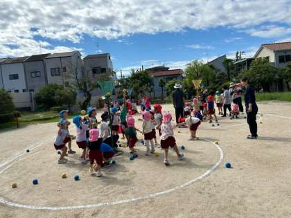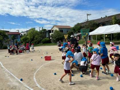 あお、あか、もも組で3つのグループに分かれて、玉入れをしました。