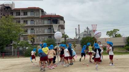 100周年記念運動会で、鈴割りをしようとお家の人に作ってもらったチェック柄の玉を使って、遊んでいます。うまく割れてくれるといいなと考えています。