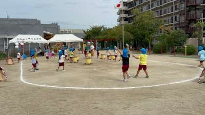 太鼓を交代しながらたたき、「そいや!」のかけ声で楽しくできるようになってきました。みんなで気持ちを合わせて、頑張っています。