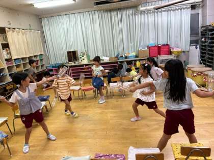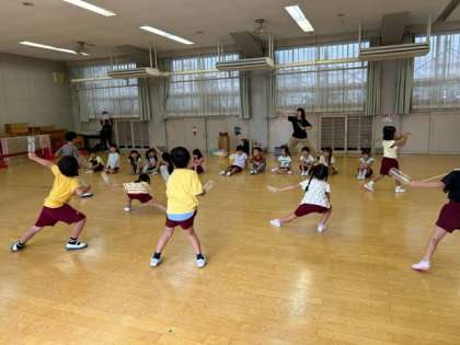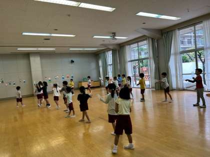 登園してくると、音楽をかけて、友達と一緒に踊っているあお組。みんなで息を合わせて踊ることが楽しみになってきている様子です。グループに分かれて見合いっこをしたり、全員で踊ってかけ声を合わせたり、みんなでかっこよくなりたいと真剣に踊っています。