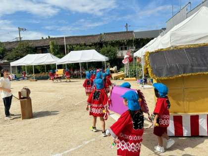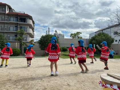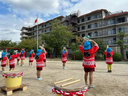 あお組は、お神輿や太鼓を使ってお祭りです。かっこよくリズムを合わせて、みんなで「ソイヤ!」と頑張りました。