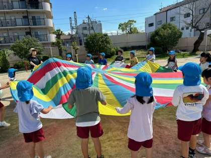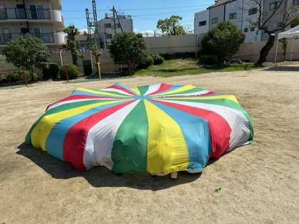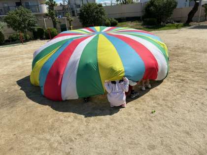 あか組のお手伝いで、パラバルーンを使って、とんぼたちを捕まえています。でも自分たちも中に入ってみたいと遊んでみました。でも、なかなかうまく膨らみませんね。