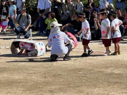 あか組トンボは元気よく飛び立ち、キャタピラや平均台渡りなどしっかりと体を動かして遊びました。コウモリに捕まえられても袋を破って飛び出し、素敵なステッキを持って、楽しくトンボの運動会をしました。