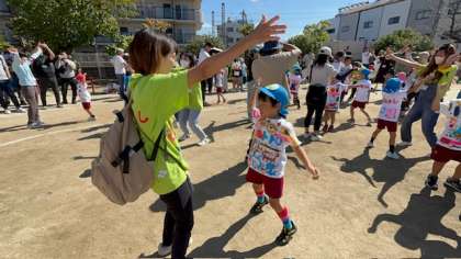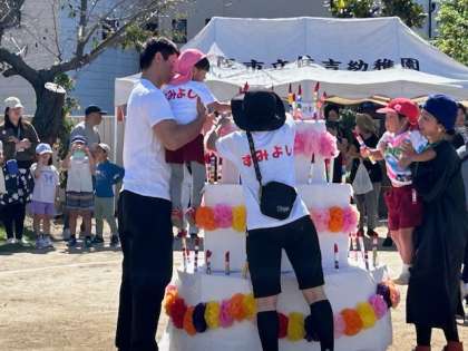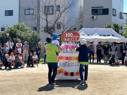 最後は、ケーキにみんなでろうそくを飾りました。100本のろうそくと一枚のプレートで100周年をお祝いすることができました。お家の人と一緒にお祝いのダンスも踊って、子どもたちと保護者の笑顔が園庭にあふれていました。