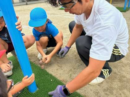 園庭の遊具の下のマットを置き換えています。マットを固定していると、「手伝うわ!」と事業担当主事さんと一緒にマットを固定して園庭整備をしてくれました。