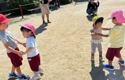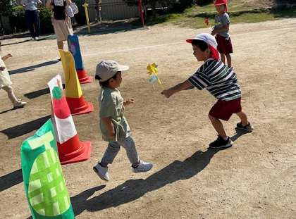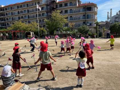 かけっこをしたり、運動会で踊ったダンスを見てもらったり、一緒に100周年記念のお祝いのダンスを踊ったりしました。